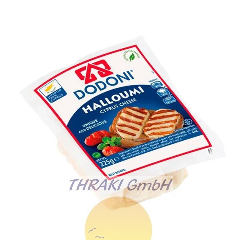Halloumi ist ein aus Kuh-, Ziegen- und Schafmilch hergestellter Käse. Der Grillkäse von Dodoni ist leicht mit Minze verfeinert und kann entweder gegrillt oder in der Pfanne gebraten werden.