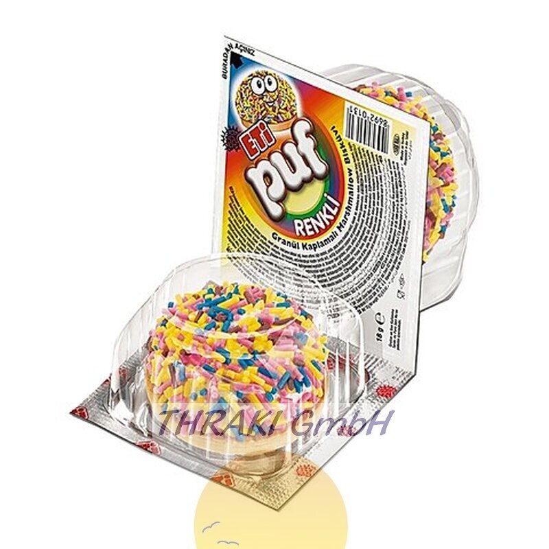 Unten knusprig, oben weich - die schaumigen Marshmallow Kekse von ETI gibt's mit kunterbunten Streuseln oben drauf. Die Farbe der Streusel kann von der Darstellung abweichen.