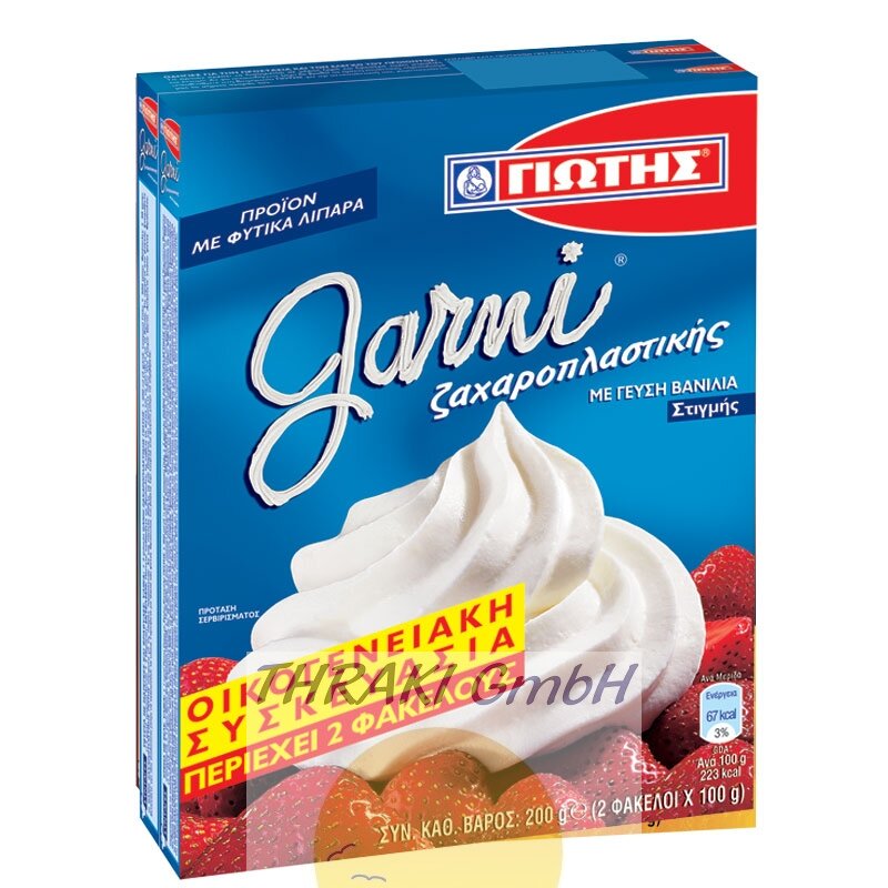 Mit Giotis Garni können Sie in wenigen Minuten eine flauschige, köstliche Schlagsahne zubereiten, indem Sie sie einfach mit kalter Milch mischen.