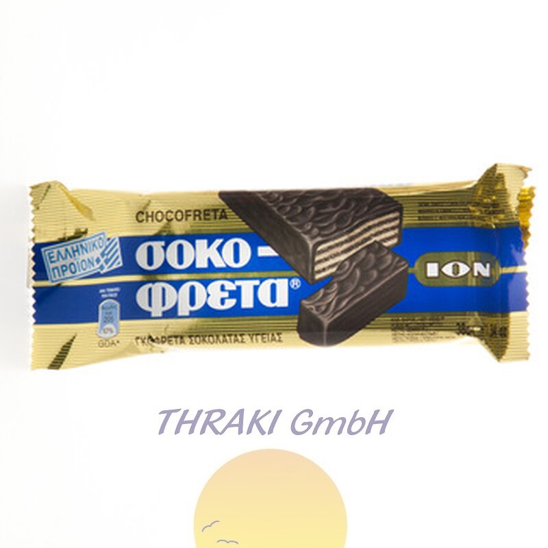 Knusprige Schokowaffel umhüllt von Zartbitterschokolade. Schokofreta von Ion gilt in Griechenland als Synonym für einen leichten süßen Snack. Ion Schokofreta ist der meistverkaufte Waffelriegel in Griechenland.