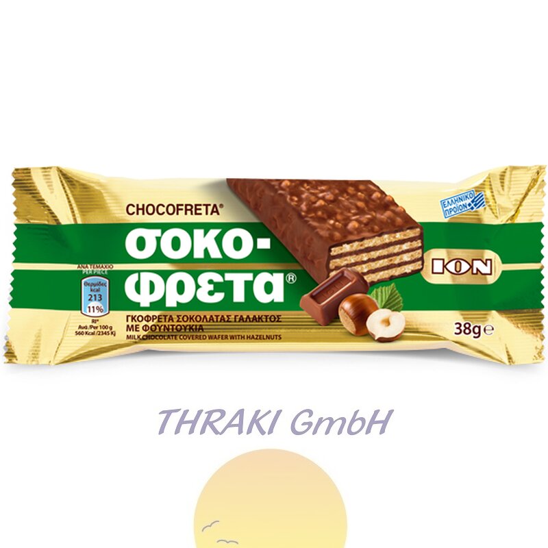 Ion Schokofreta grün: knuspriger Schoko-Waffel-Riegel mit Milchschokolade, gefüllt mit Haselnusscreme. Schokofreta gilt in Griechenland als Synonym für einen leichten süßen Snack. Ion Schokofreta ist der meistverkaufte Waffelriegel in Griechenland.