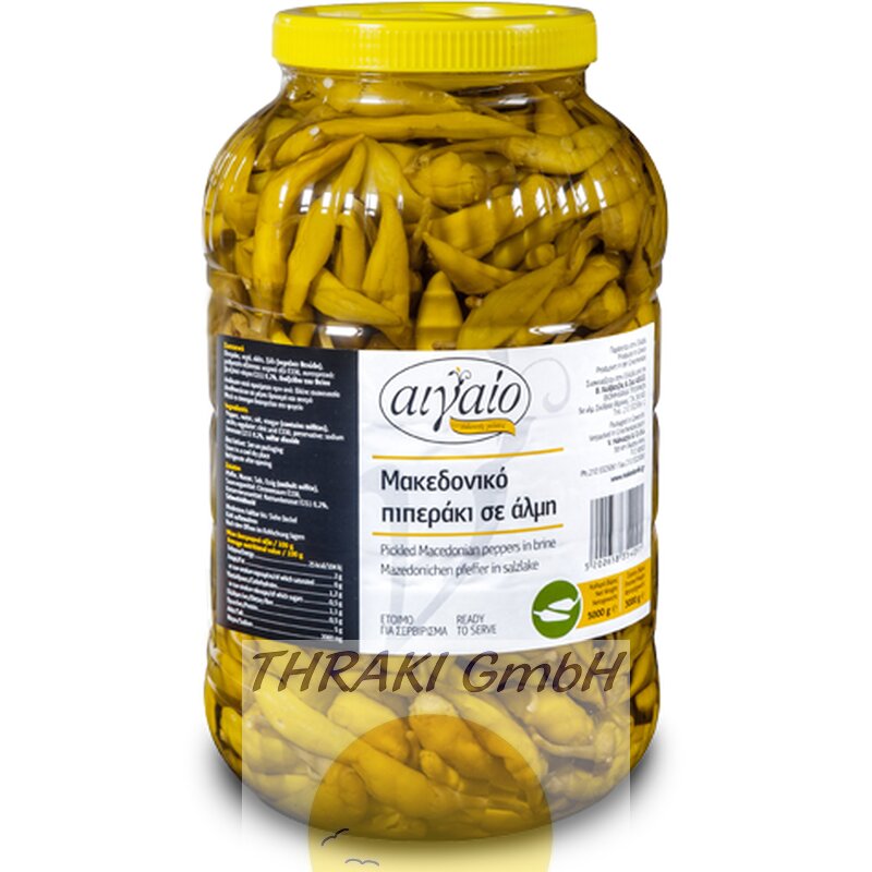 Zutaten: Peperoni, Wasser, Salz, Essig (enthält Schwefel) Säureregulator: Zitronensäure, Konservierungsmittel: Natriumbenzoat E 211 0,2%, Schwefeldioxid Abtropfgewicht: ca. 2,75Kg