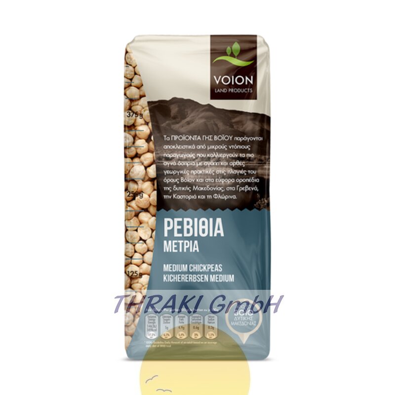 Anbau: Die Region Voio, nahe der Grenze zur Präfektur Grevena, ist auserwählt worden für den Anbau mittelgroßer Kichererbsen. Die moderate Bodenfruchtbarkeit, die Höhenlage der Region und die einheimischen Sorten ergeben mittelgroße Kichererbsen einzigartiger Qualität.